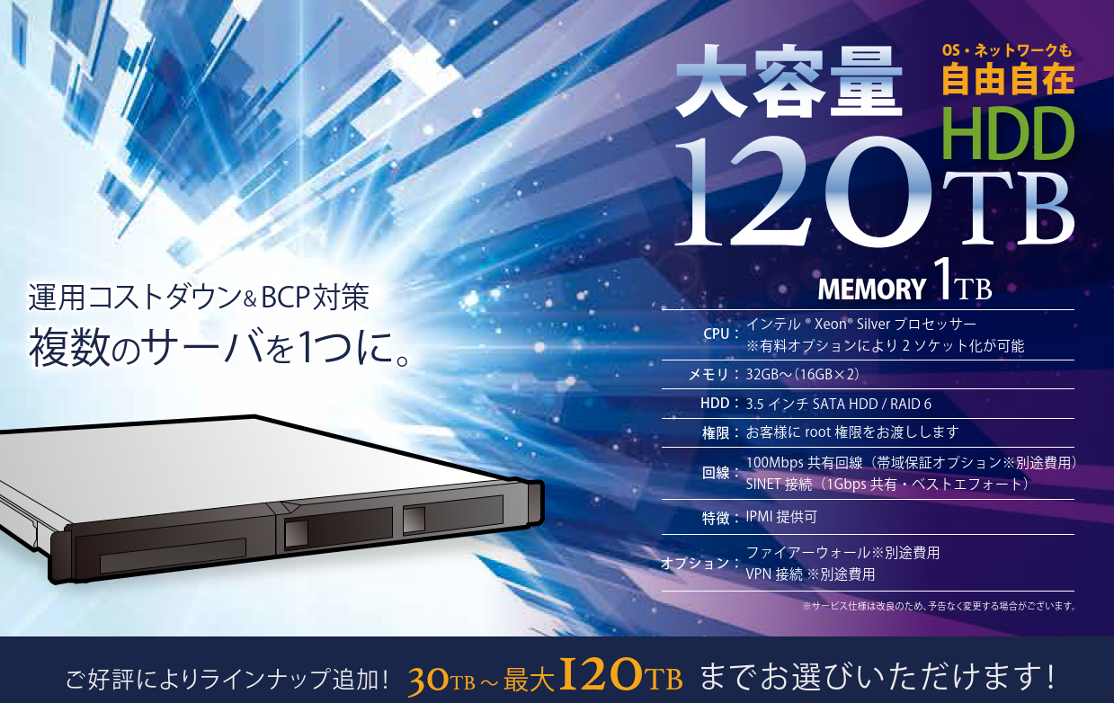 ミライネットのレンタルサーバサービスから新たな大容量専有サーバサービスが登場!最大120TBの広大なディスク領域をご提供します。